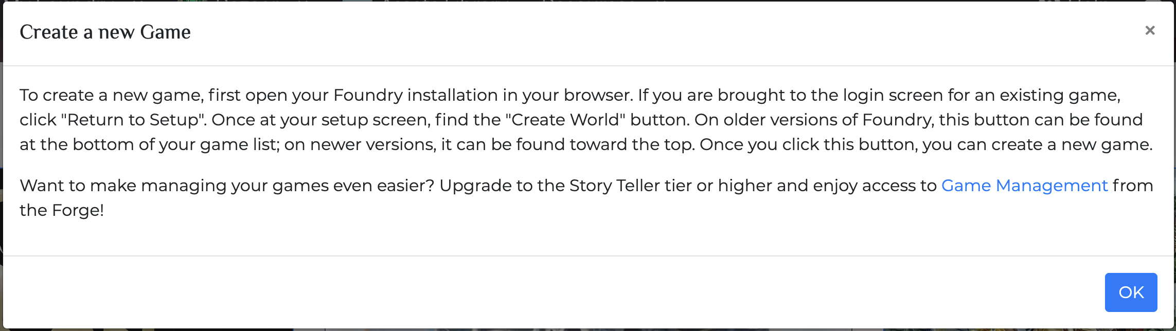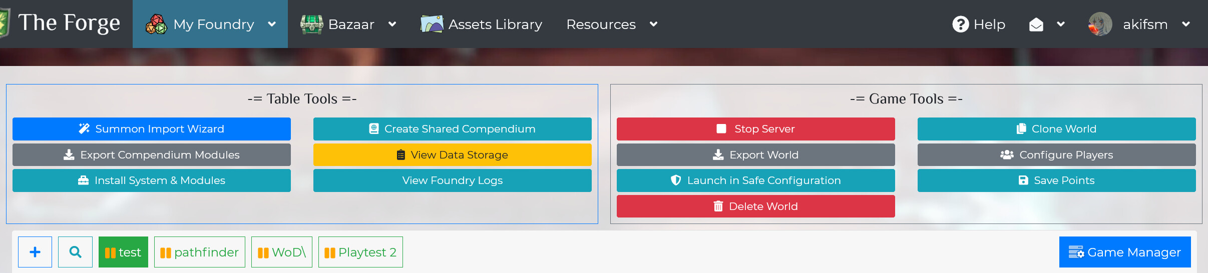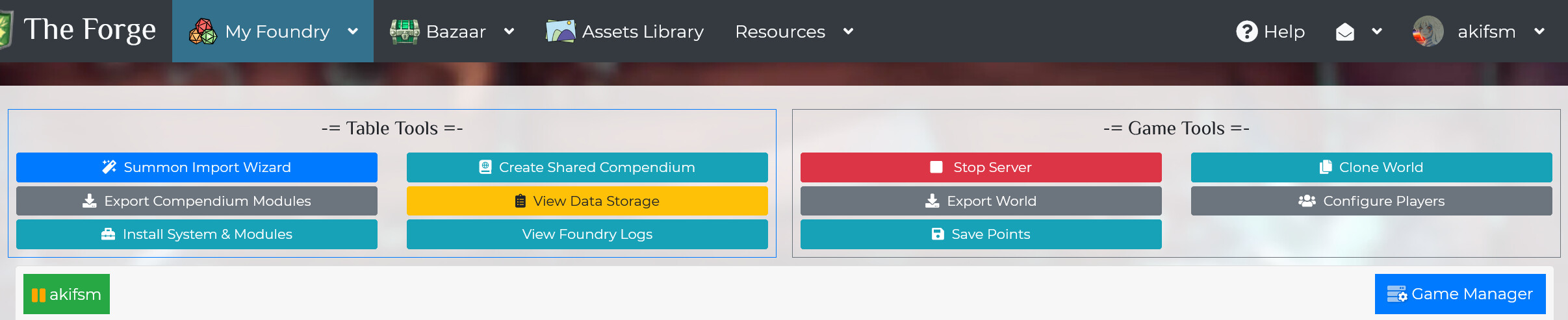 I have a Game Master account. I realize this is the lowest subscription tier, and I’m not able to use the excellent tools The Forge created to help automate the management of Foundry. Due to my subscription tier, I must manage Foundry directly, which suits my needs for the one game I created.